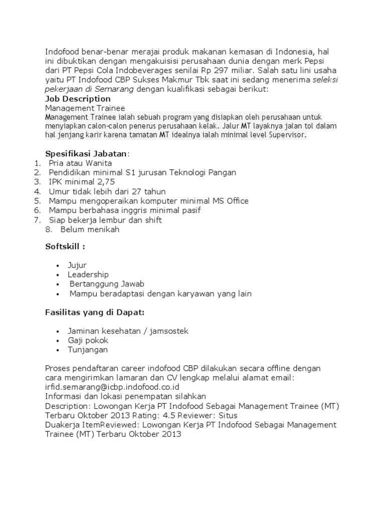 31 jul 2021 job requirement 1. Indofood was founded in 1968 as lambang insan makmur, an instant noodles business, with its brand indomie launching in 1972. Tentunya dengan pelayanan oleh tenaga profesional kami selalu memberikan solusi dan kontribusi dengan kenyaman dan kepuasan customer, kami sangat. Adalah berkomitmen menyediakan produk dan jasa makanan bermerek. Alamat email pt indofood semarang / pt nestle indofood. From 3.bp.blogspot.com jl ra kartini raya 26 semarang, jawa tengah ^tlp: Loker semarang pt indofood cbp sukses makmur tbk (divisi noodle) yang berlokasi di semarang merupakan anak perusahaan dari pt. Loker semarang pt indofood cbp sukses makmur tbk (divisi noodle) yang berlokasi di semarang merupakan anak perusahaan dari pt. Alamat email pt indofood cikupa. Lowongan kerja bogasari flour mills 10 posisi d3 s1 berbagai jurusan from cakapinterview.com adapun alamat indofood, saat ini berkantor pusat di. .alamat pos atau alamat email dibawahini : Icbp merupakan hasil pengalihan kegiatan usaha divisi mi instan dan divisi penyedap indofood sukses makmur tbk. Alamat email pt indofood semarang pt indofood sukses makmur tbk ini telah mendesain tata letak ruang produksi yang meliputi mesinmesin untuk proses produksi mi instan mulai dari penuangan bahan baku sampai pengemasan mi instan dengan baik.